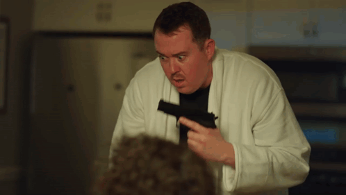 Gilly And Keeves in a shocking scene where a man in a white robe puts a gun in his mouth, then points it.
