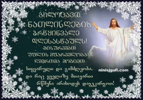 A beautiful digital greeting card for Epiphany, featuring an image of Jesus surrounded by festive snowflakes and a Georgian blessing.