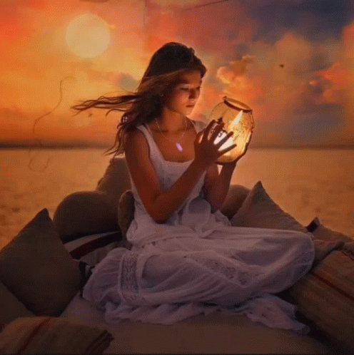 Gina101 Creative features a woman in a white dress holding a glowing candle at a serene sunset ocean.