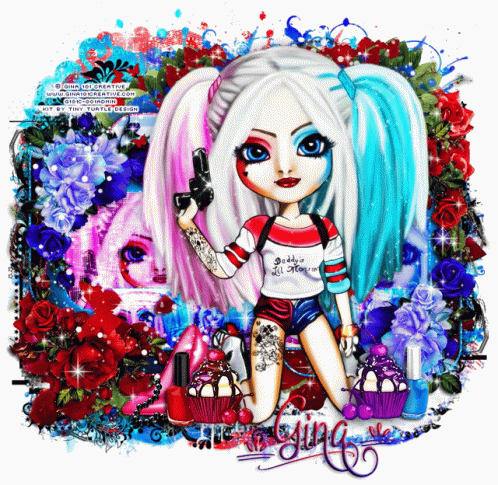 Gina101creative's cute chibi art of Harley Quinn with pink and blue pigtails, holding a gun, surrounded by roses and cupcakes.