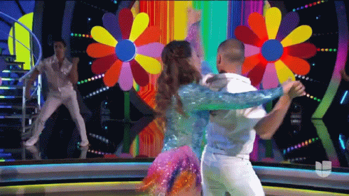 Lindsay Casinelli and a male partner perform a lively salsa dance, spinning on a colorful stage.