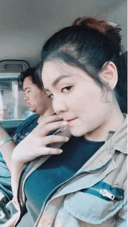 A cute Asian girl takes a selfie in a car, with a man visible in the background.