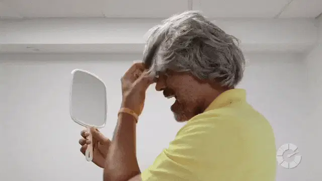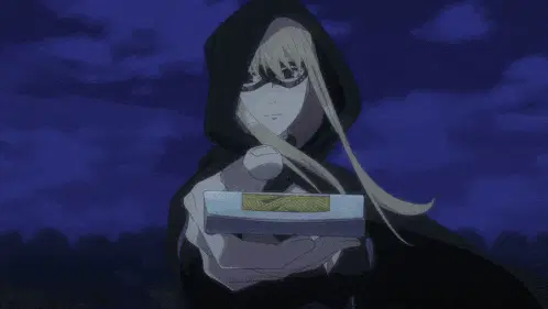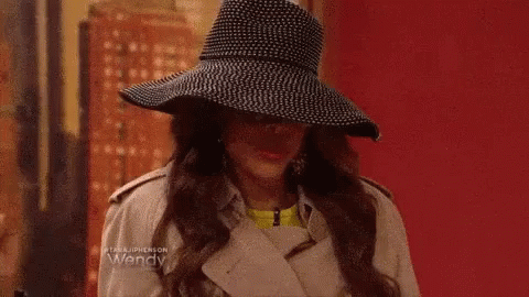 A woman in a wide-brimmed hat and trench coat looks up, maintaining a secretive demeanor.