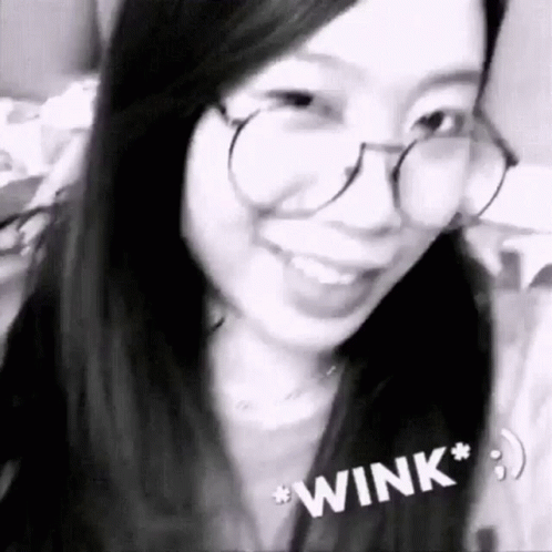 A cute girl with long dark hair and round eyeglasses winks and smiles charmingly in a black and white video.