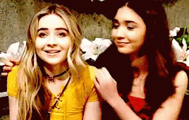 Rowan Blanchard and Sabrina Carpenter from Girl Meets World share a warm moment, sitting close together.