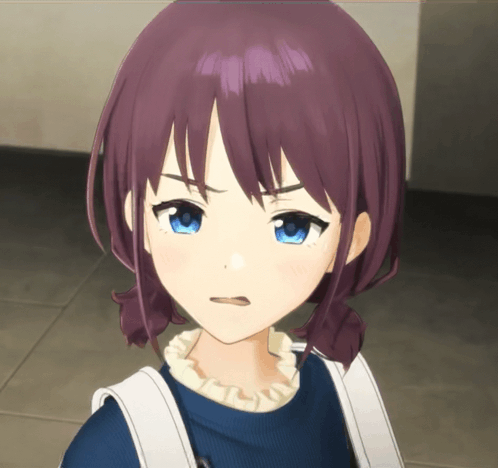 Iseri Nina from Girls Band Cry shows a displeased expression, featuring her purple hair and blue eyes.