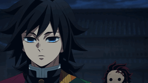 Giyu Tomioka, the Water Hashira, stands with Tanjiro Kamado in a scene from Demon Slayer.