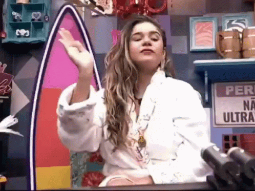 Gizelly Bicalho, wearing a bathrobe, greets viewers with "Bom Dia Brasil" (Good Morning Brazil) and a warm smile.