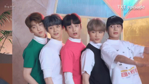 TXT members Huening Kai, Beomgyu, Soobin, Yeonjun, and Taehyun strike a playful lean-back pose for a TXT episode.
