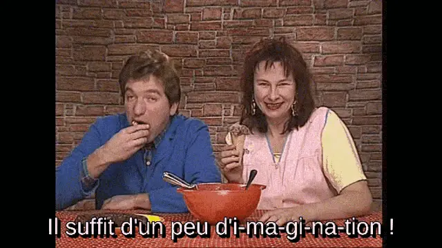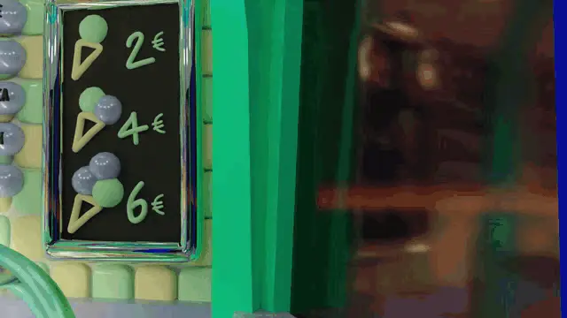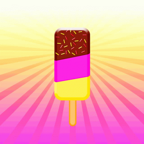 Philomène's delicious layered ice cream popsicle with chocolate, sprinkles, pink, and yellow flavors, being eaten.