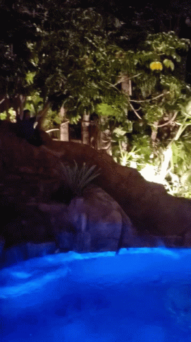 A vibrant blue swimming pool and slide illuminated at night during the Glamlive2019 event.