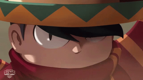A cartoon character from Brawl Stars with a determined glare, wearing a sombrero and a red scarf.
