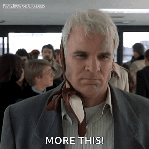 Steve Martin as Neal Page from Planes, Trains & Automobiles, glaring intensely with the caption "MORE THIS!".