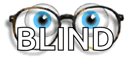 A cartoon image features blue eyes wearing glasses, with the word 'BLIND' prominently displayed.