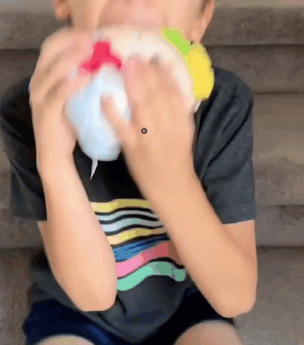 Jayden B playfully 'gobbles' a plush toy, looking up with a smile.