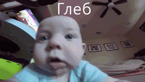 Baby Gleb makes a funny face, looking directly at the camera with wide, curious eyes.