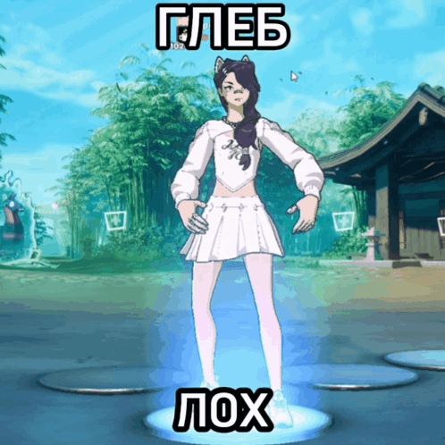 A cartoon character with cat ears dances in a white outfit, with the Russian text 'Глеб Лох' displayed.