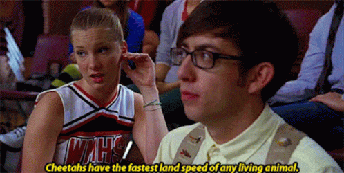 Brittany Pierce from Glee listens intently to a fun fact about cheetahs having the fastest land speed.