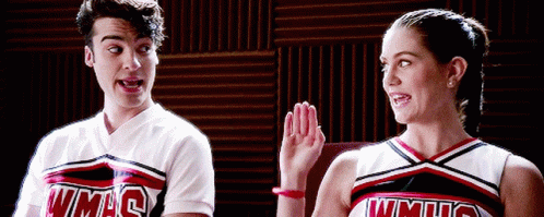 Glee's Mason McCarthy (Billy Lewis Jr) and Madison McCarthy (Laura Dreyfuss) in their WMHS cheerleading uniforms share a happy high five.
