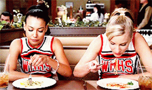 Santana Lopez and Brittany Pierce from Glee, wearing WMHS cheerleader uniforms, enjoy pasta at a restaurant.
