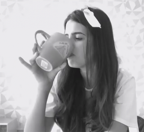 Glenda Loures sips from a large mug, enjoying a cup of coffee in a black and white setting.