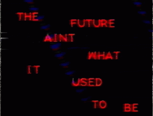 Red glitched text on a black background reads: 'The future ain't what it used to be'.