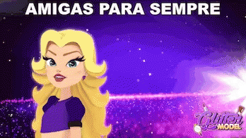 The Glitter Model cartoon girls celebrate their friendship with the phrase "Amigas Para Sempre" (Friends Forever).
