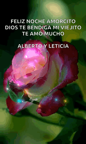 A beautiful pink rose with glittering effects, accompanied by a heartfelt message from Alberto and Leticia.