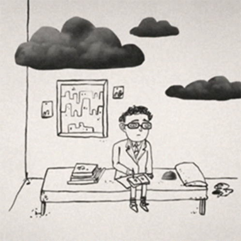 A black and white drawing depicts a gloomy John Lennon, identified as Egbert, sitting on a bed under dark clouds.