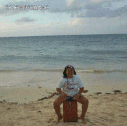 Gloria Quicano plays the Cajon Peruano on a sandy beach in Cuba, enjoying the ocean view.