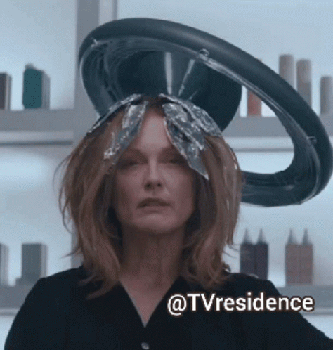 Julianne Moore as Gloria getting her hair done at a salon, under a hair processor with foils.