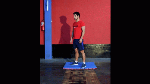A man in a red shirt and blue shorts performs squats on a blue mat.