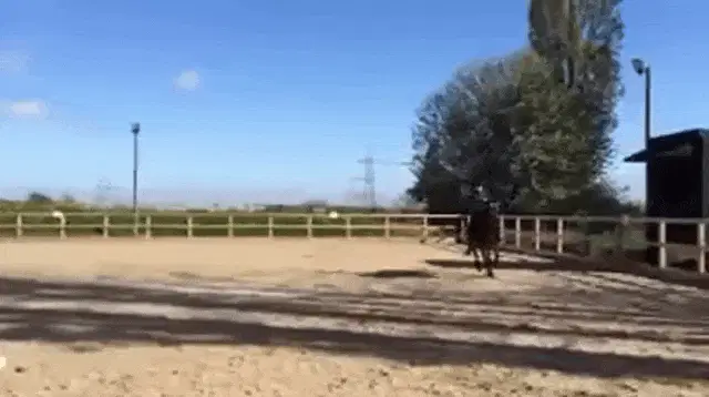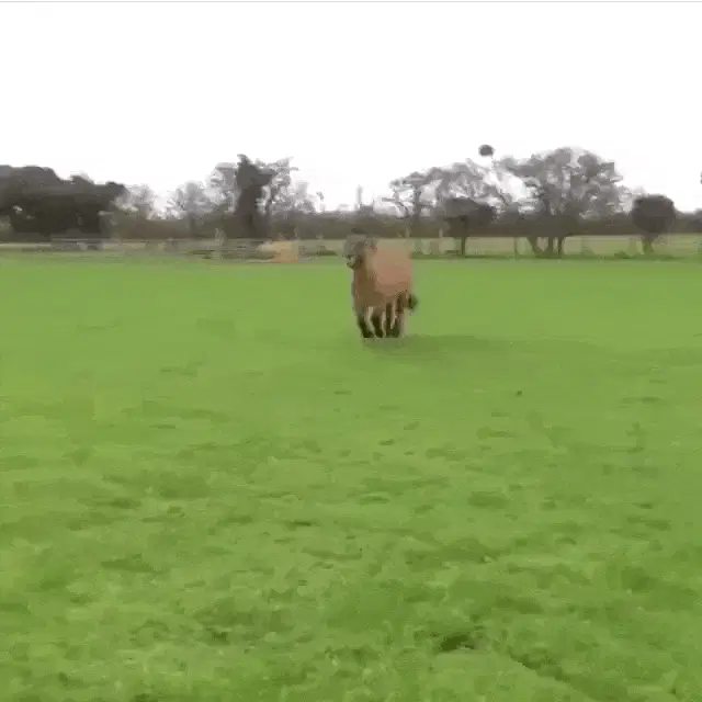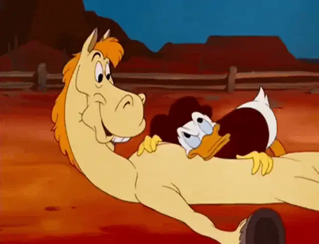 A cartoon horse from the Glue Factory Show stands at a purple door, looking surprised and yelling.