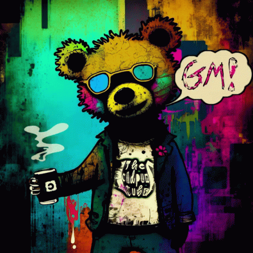 A vibrant, psychedelic GM Bear wearing sunglasses and a jacket, holding a steaming coffee cup and saying 'GM!'