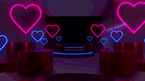 A vibrant neon display featuring '6M' and 'Crypto Monarch' surrounded by pink and blue hearts, celebrating a milestone.