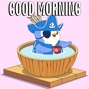 A cute pirate penguin enjoys a morning soak in a tub, sipping coffee with a cheerful 'GOOD MORNING' message.