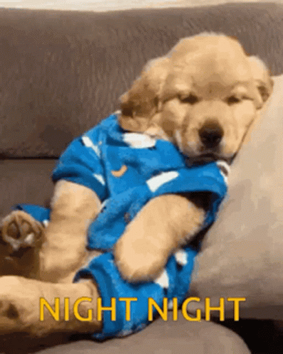 Adorable puppy Plasmaboi, belonging to Leon and Cam, yawns and sleeps soundly in blue pajamas, wishing "Night Night".