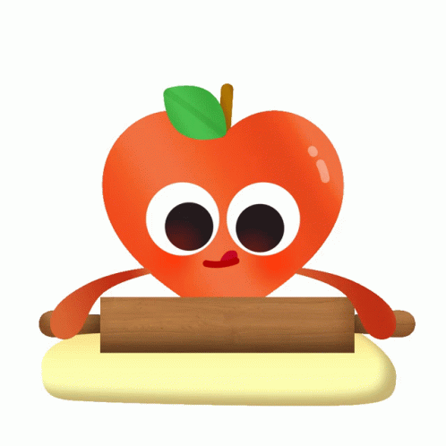 A cute cartoon apple character with big eyes uses a rolling pin to flatten a piece of dough.