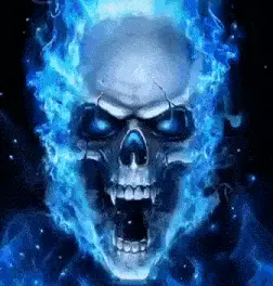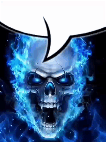 Blue flaming skulls with speech bubbles multiply, showcasing intense anger and rage.