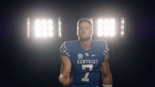 Kentucky Wildcats football player Will Levis in his blue jersey, ready for action under bright lights.