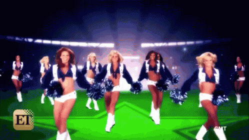 Dallas Cowboys cheerleaders perform a dynamic dance routine on stage.