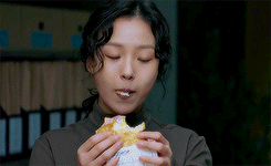 Go Minsi eating a sandwich, chewing and nodding while enjoying her food.