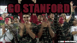 Stanford football fans cheer enthusiastically, showing their support for the team with painted faces.