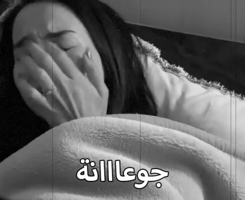 A black and white image of a woman covering her face, expressing sadness and hunger with the Arabic text 'جوعااانة'.