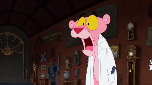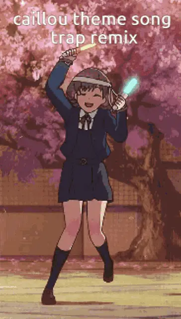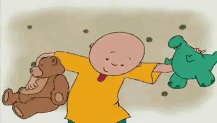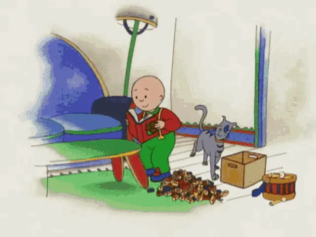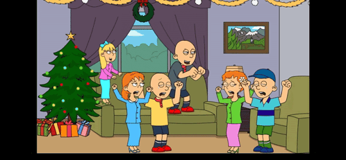 Goanimate Caillou and family in a festive living room, reacting with raised arms during a Christmas scene.
