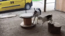 A goat playfully spins on a large wooden spool while another goat watches in a barn setting.