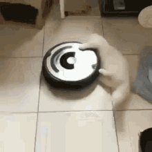 A playful white cat bats and rolls around a robotic vacuum cleaner on a tiled floor, enjoying its movement.