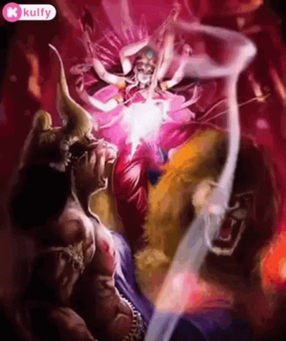 Vibrant depiction of Goddess Durga in battle, slaying the demon Mahishasura, celebrating Navratri and Dussehra.
