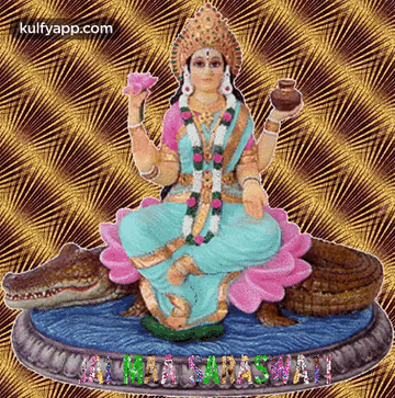 A beautiful statue of Goddess Saraswati, sitting on a lotus flower next to a crocodile.
