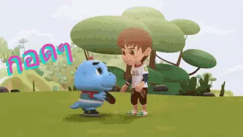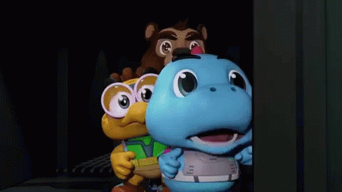 Godji Ptt and friends, three cartoon characters, look scared and hide in a dark, confined space.